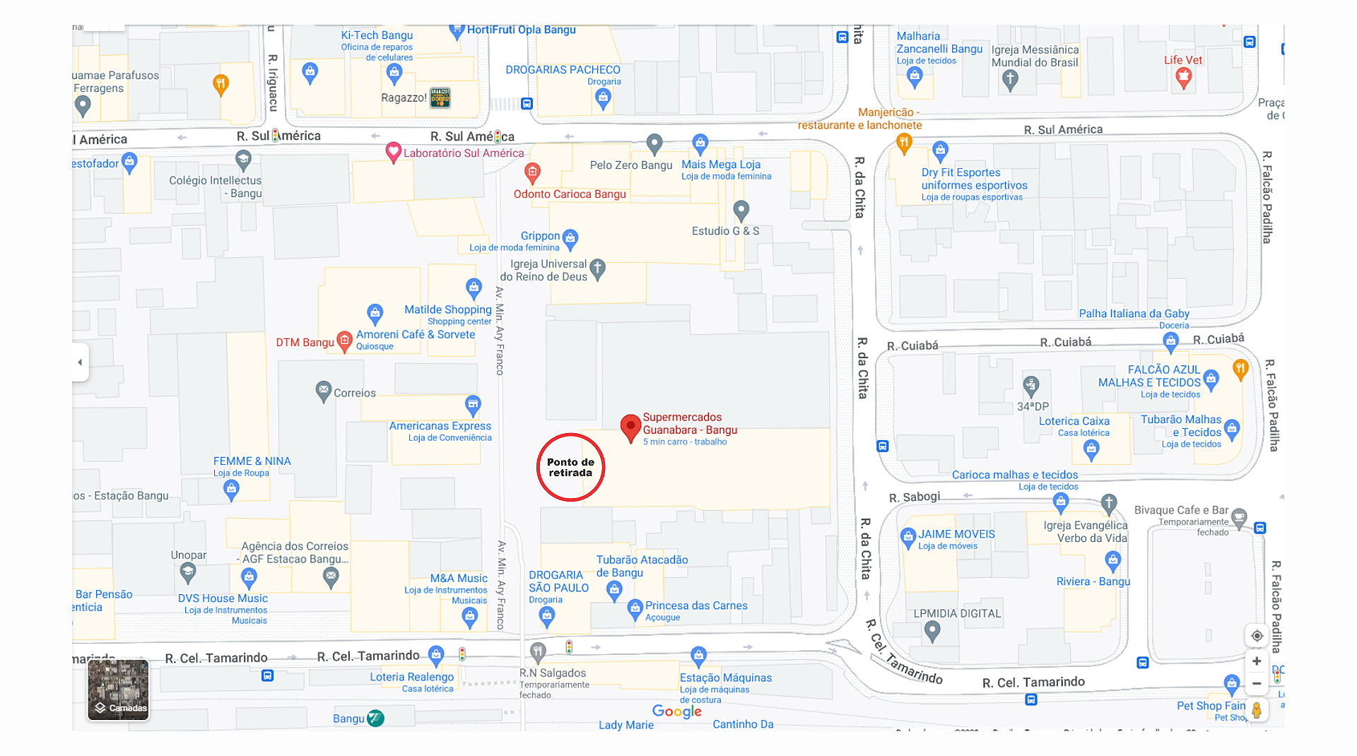O nosso ponto de retirada se localiza na Avenida Ministro Ary Franco - Bangu - Centro (Calçadão - Lado esquerdo sentido Rio centro) enfrete ao Supermercados Guanabara. Horário de entrega das 10:00 às 11:00 horas da manhã, toda a Sextas-feira. Para mais informações fale consoco através do WhatsApp pelo número (21) 96960-1411.